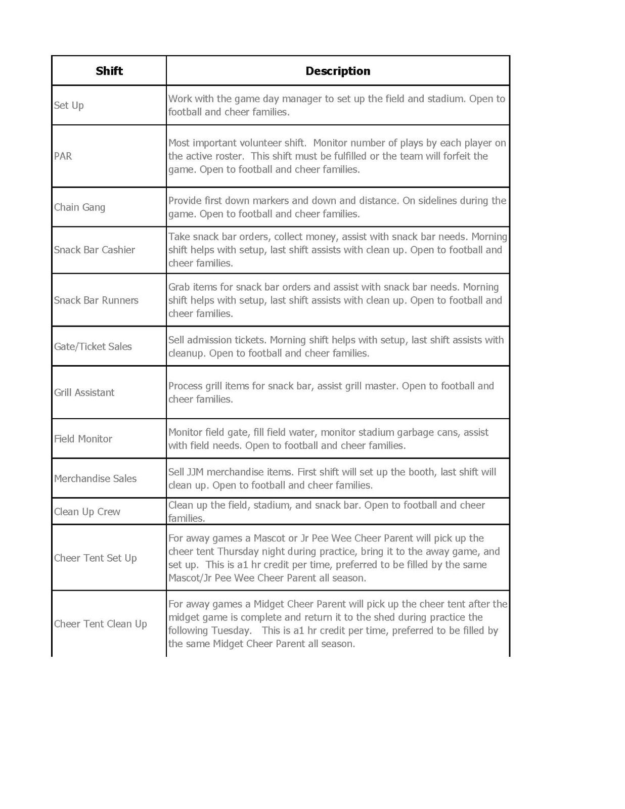 See below for descriptions of JJM Volunteer shifts. Not all shifts are available all games, and hours credit may vary. All open volunteer positions will be posted on volunteer signs ups at the start of the season.